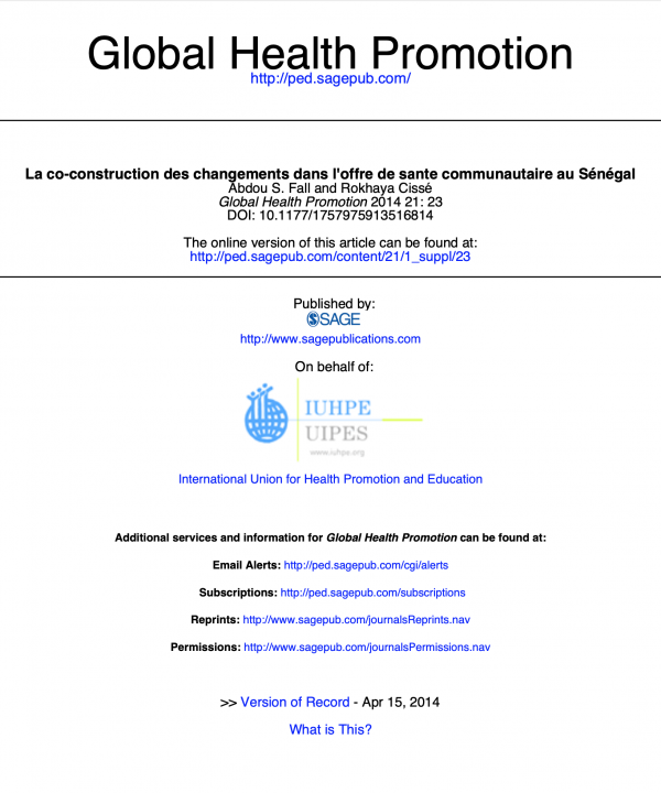 Dans les quatre régions du centre du Sénégal où cette expérience a été initiée, la recherche effectuée a permis de comprendre les processus et les épreuves permettant une « co-construction » de savoirs entre praticiens et chercheurs, dans un contexte d’accès aux soins relativement faible. Cet article met en relief l’importance de cette co-construction favorisant les engagements concertés pour des changements pertinents en faveur d’une meilleure offre de proximité, plus équitable et davantage accessible aux communautés. (Global Health Promotion, 2014; 21 Supp. 1: 23–30).
